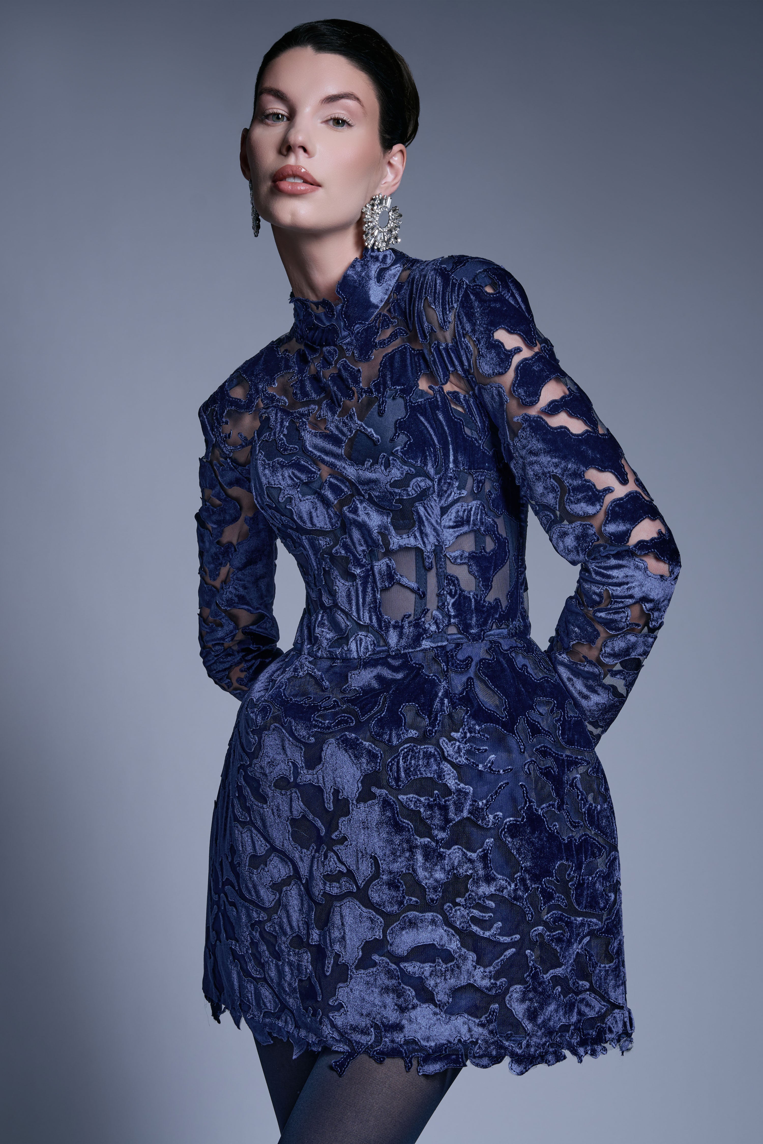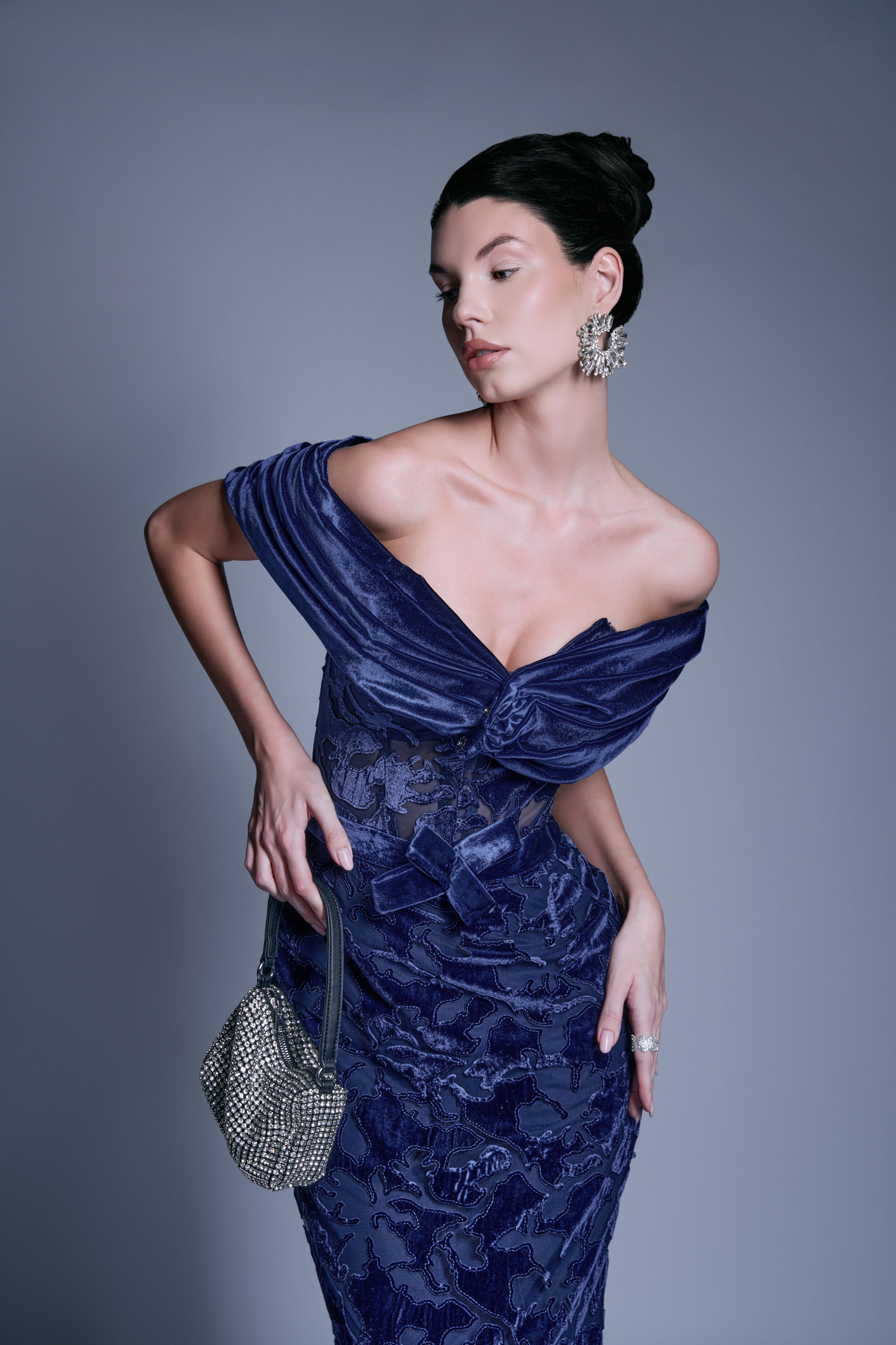 EVENING GOWN WITH VELVET LACE EMBROIDERY
